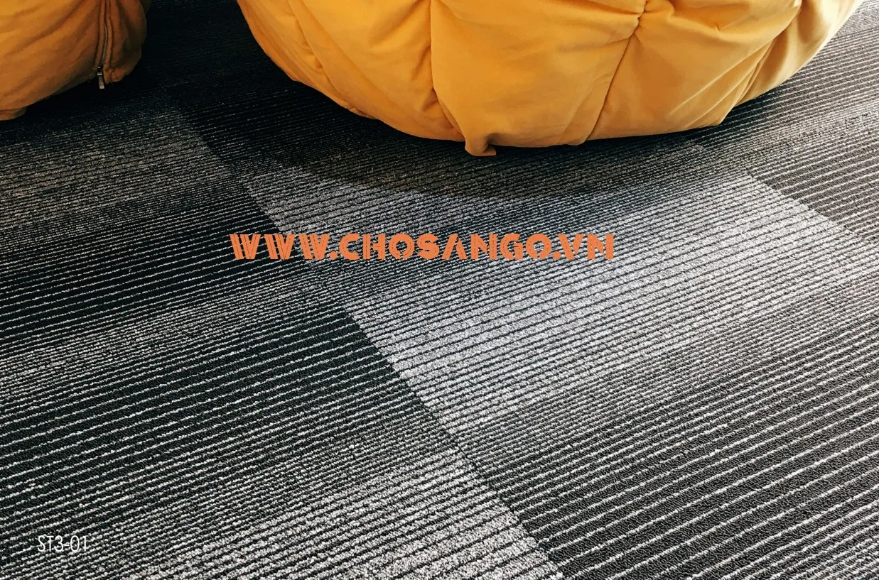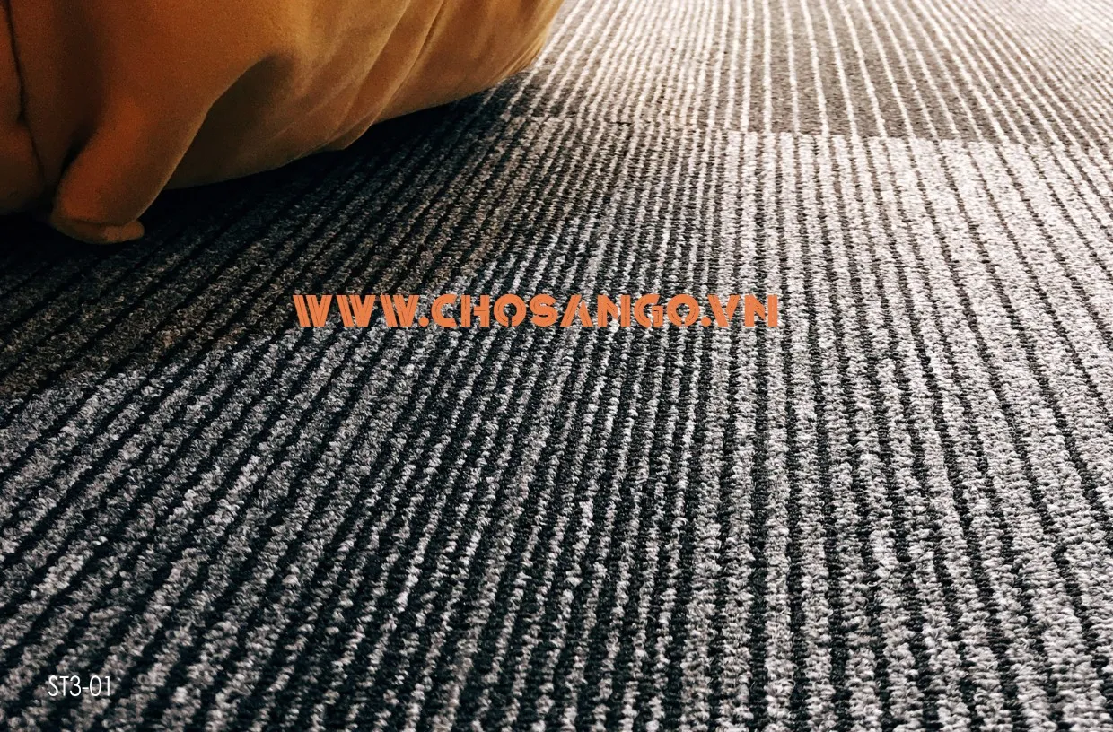 Thảm tấm ST301 hoa văn xọc, màu xám grey. Thảm tấm ST301 chất liệu sợi pp, từng tấm ghép với nhau tạo thành khối đồng nhất. Đây là dòng thảm dành cho văn phòng, hotel, trường học.